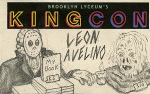 Luckily, our pal and talented Secret Artist, John Brodowski, had come down from Vermont to sit with us, sign books and keep things lively. Take a gander at the name tag he made for Leon below.